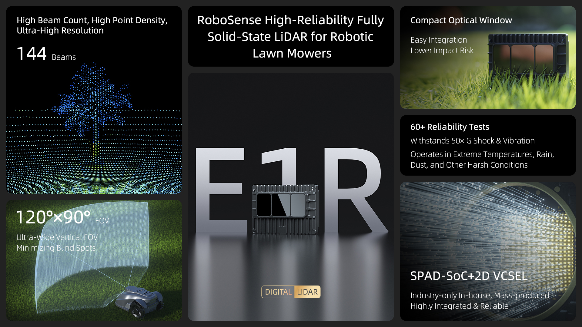 The E1R, the world’s first fully solid-state digital LiDAR for robotics, features a 90° ultra-wide vertical FOV and 144 beams, allowing precise detection of small ground obstacles, terrain changes, and fence edges—facilitating accurate localization, mapping, and navigation for robotic lawn mowers. Its fully solid-state design ensures resilience to vibration, bumps, and shocks, improving operational stability on rough terrain by up to three times. Built to automotive-grade standards, the E1R has passed more than 60 reliability tests, including UV aging, salt spray, and electromagnetic compatibility, and can reliably operate in harsh conditions such as rain and dust. With an outdoor service life of up to 8 years, far exceeding industry standards, it serves as the optimal perception partner for all-weather, all-condition robotic lawn mower operation.